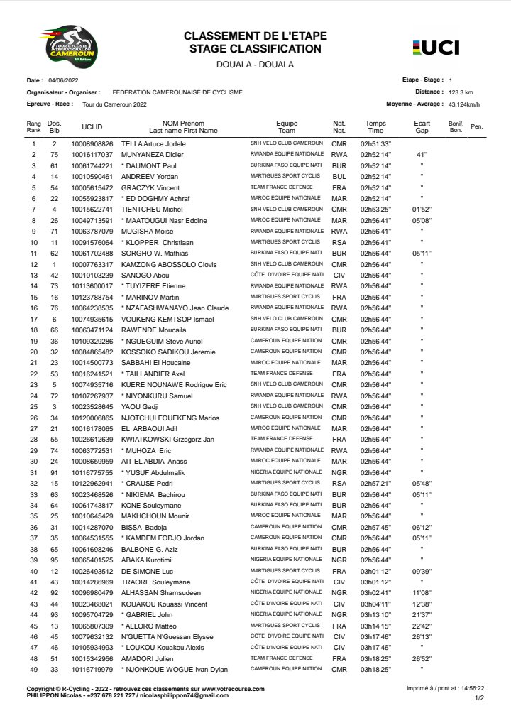 Agace ka mbere kabaye uyu munsi, ryabereye mu mujyi wa Douala aho basiganwe intera ya kilometero 123.3, aho umunya-Cameroun Terra Artuce Jodele ukinira ikipe ya SNH Velo Cameroun ari we waje ku mwanya wa mbere.
