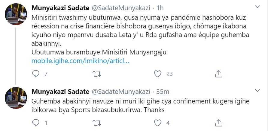 Perezida w’ikipe ya Rayon Sports Munyakazi Sadate, nyuma yo kubona ubutumwa bwa Minisitir wa Siporo akangurira abantu kuguma kwirinda iki cyorezo baguma mu rugo, kugira ngo bazabashe kongera gusubira mu buzima bwa siporo vuba, yaje guhita atanga igitekerezo ku rubuga rwa Twitter.