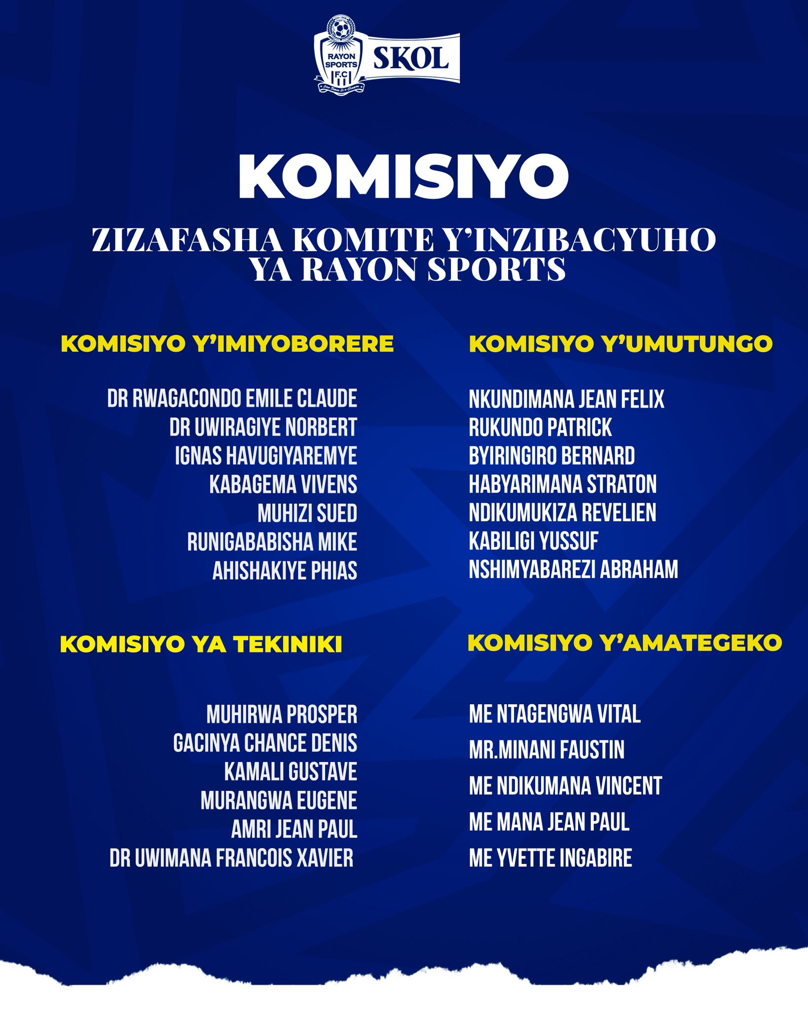 Uretse kuba barashyizweho ariko nabo bafite abazabafasha mu kubaha inama, babumbiwe mu makomisiyo buri wese bitewe naho azafasha aho hagaragaramo amazina asanzwe azwi mu nzego za Rayon Sports mbere y’uko ziseswa barimo Dr Emile Rwagacondo uzafasha muri Komisiyo y’Imiyoborere na Gacinya Chance Denis uzafasha muri Komisiyo ya Tekinike.