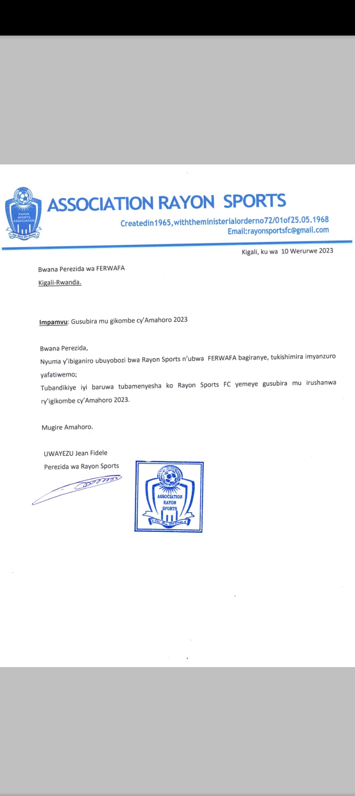 Mu ibaruwa yanditswe n’ikipe ya Rayon Sports, yavuze ko igarutse mu gikombe cy’Amahoro nyuma y’ibiganiro yagiranye na FERWAFA, igasanga byo bitayibangamiye igahitamo kugaruka.