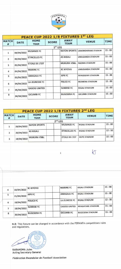 Kuri uyu wa Gatanu kuri FERWAFA habereye tombola ya 1/8 mu gikombe cy’Amahoro, aho ndetse hanakozwe uburyo amakipe azagenda ahura kugera ku mukino wa nyuma hatiriwe haba indi tombola.