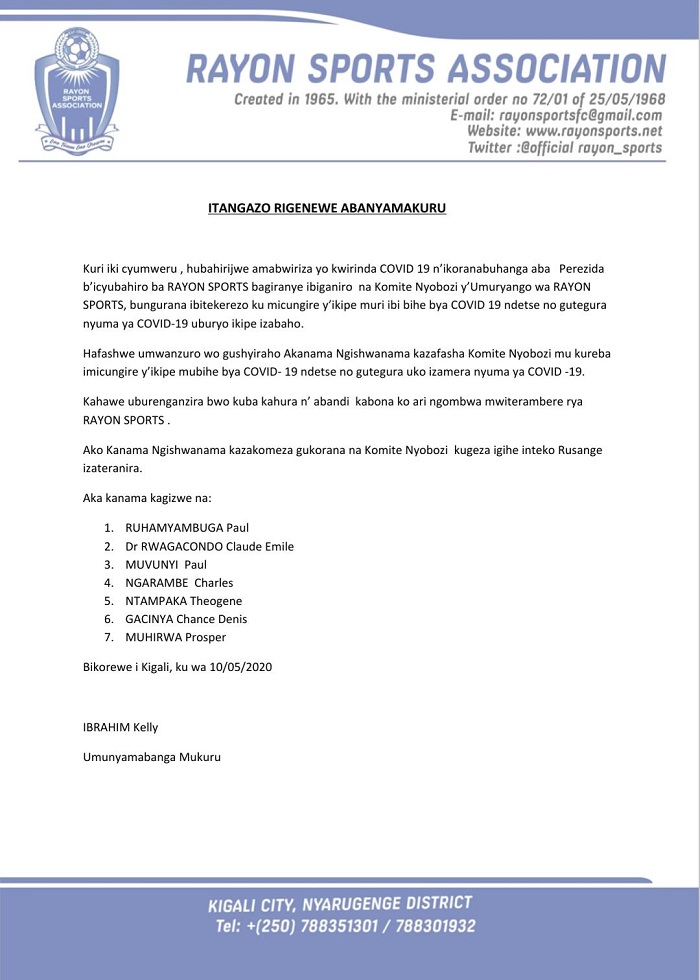 Rayon Sports kugeza ubu iraba iyoborwa na Muhire Nsekera Jean Paul usanzwe ari Visi Perezida wa mbere, akazakorana n’akanama ngishwanama kagizwe n’abayobozi barindwi bahoze bayobora Rayon Sports.