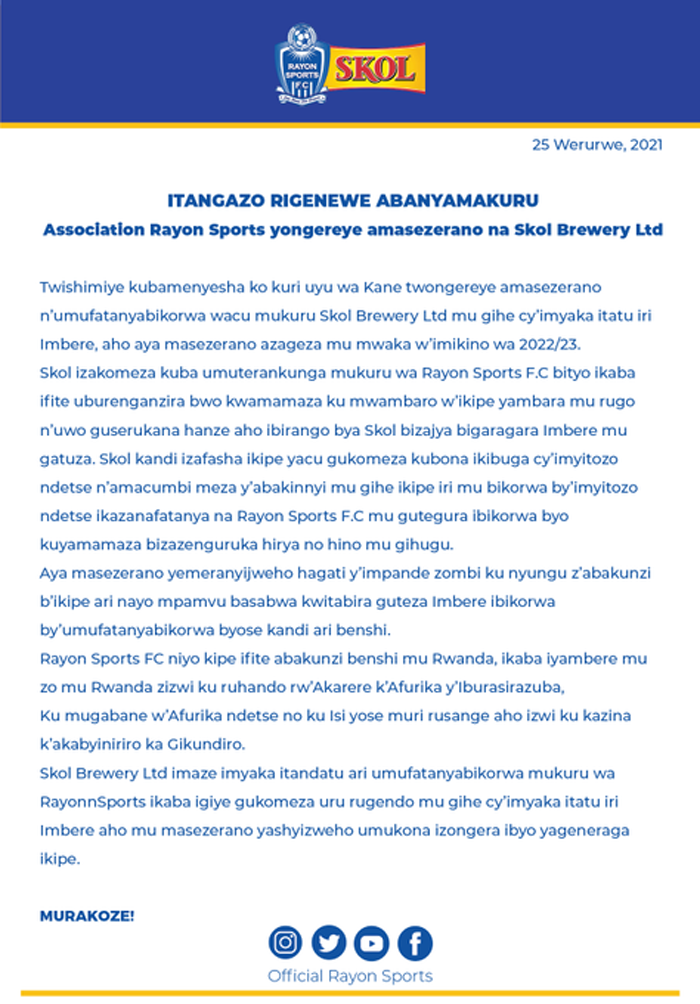Kuri uyu wa Kane tariki 25/03/2021, ku cyicaro cy’uruganda rukora ibinyobwa rwa Skol Brewery Ltd habaye umuhango wo kuvugurura amasezerano hagati ya Rayon Sports na Skol, amasezerano yari amaze imyaka itandatu.