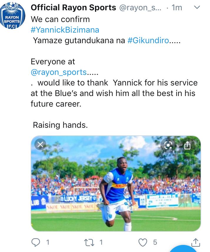 Kuri uyu wa Gatandatu ni bwo ikipe ya Rayon Sports yaje gutangaza ko yamaze gutandukana n’uyu mukinnyi ibinyujije ku rubuga rwayo rwa Twitter.