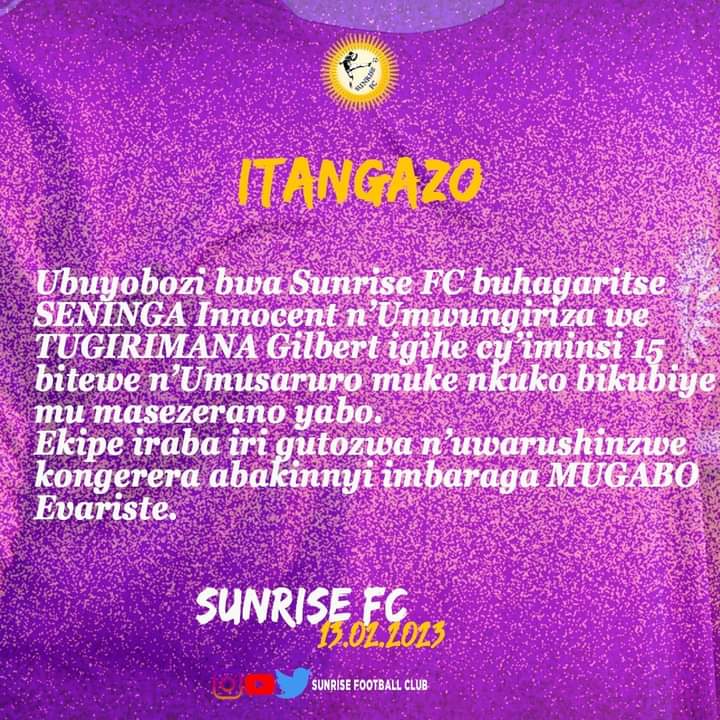 Iti" Ubuyobozi bw’ikipe ya Sunrise FC buhagaritse Seninga Innocent n’umwungiriza we Tugirimana Gilbert igihe cy’iminsi 15 bitewe n’umusaruro mucye nkuko bikubiye mu masezerano yabo."