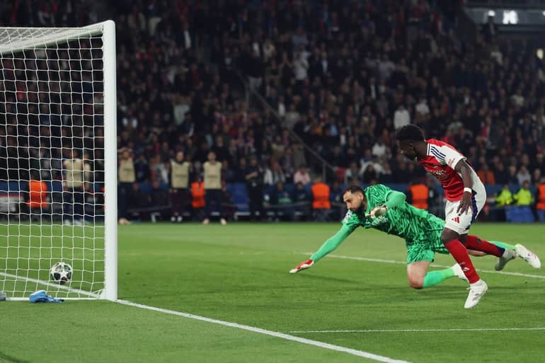 Icyakora, ibi byishimo byabaye iby’akanya gato kuko Achraf Hakimi yahise abigira 2-0 ku munota wa 74, biba 3-0 uteranyije imikino yombi. Nyuma y’iminota ibiri yonyine, Bukayo Saka Ayoyinka Temitayo yahise agomboreramo Arsenal igitego kimwe, amaze kwakira neza umupira yahaye na Leandro Trossard winjiye mu kibuga asimbuye Gabriel Teodoro Martinelli Silva. Ibi ariko ntacyo byamaze kuko umukino warangiye PSG itsinze 2-1, isezereye Arsenal ku giteranyo cy’ibitego 3-1 mu mikino ibiri.