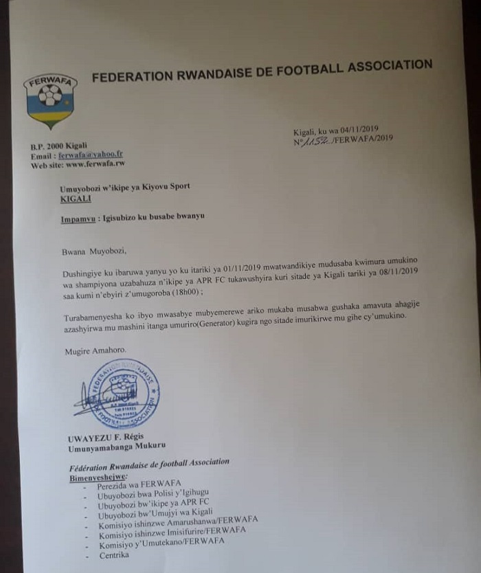 Mu ibaruwa ishyirahamwe ry’umupira w’amaguru mu Rwanda FERWAFA ryandikiye ikipe ya Kiyovu Sports risubiza iyo iyi kipe yari yanditse isaba ko umukino wakwimurwa, FERWAFA yavuze ko ubusabe bwa Kiyovu bwemewe.