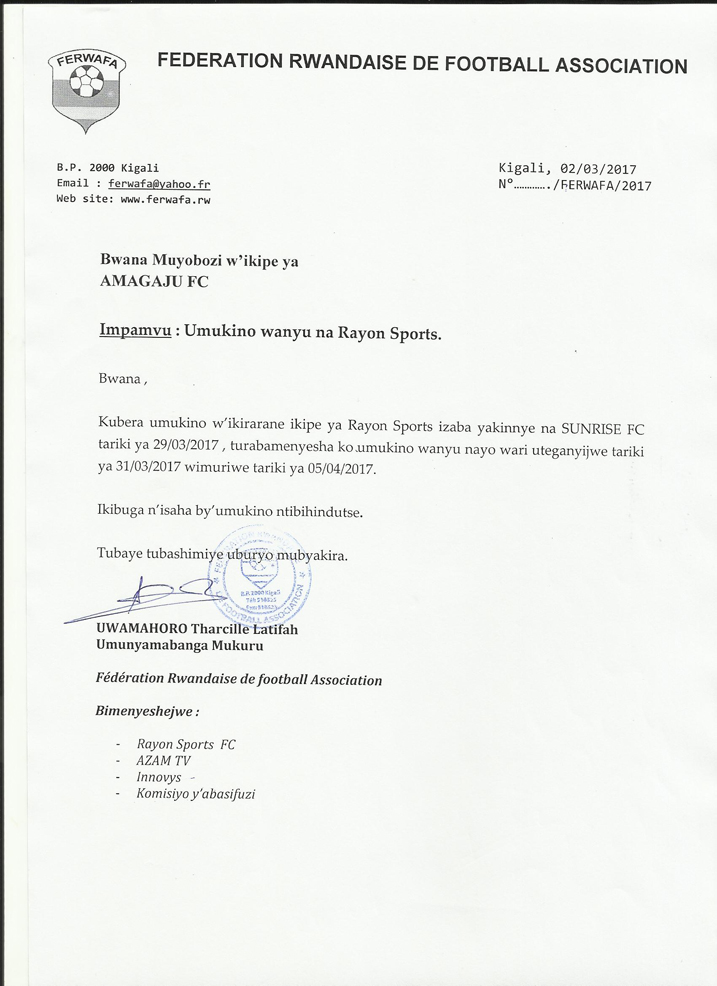 Mu gihe bamwe mu bakunzi b’umupira w’amaguru mu Rwanda batekerezaga ko ikipe ya Rayon Sports izakina imikino ibiri ya Shampiona mu minsi itatu gusa, umukino Rayon Sports yagombaga kwakiramo ikipe y’Amagaju kuri uyu wa gatanu, wimuriwe ku itariki ya 05 Mata 2017, ukazabera kuri Stade ya Kigali.