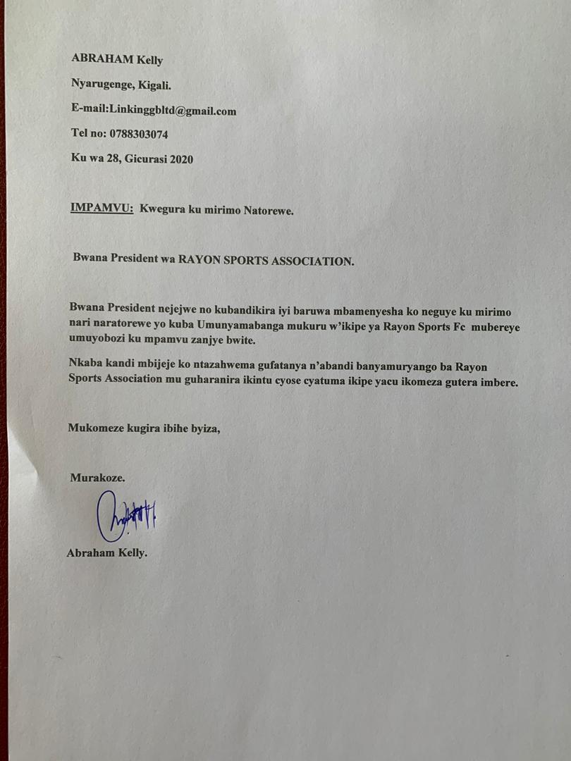 Muri iki gitondo ni bwo ibaruwa yo kwegura k’uyu munyamabanga yatugezeho, aho yandikiye umuyobozi w’umuryango wa Rayon Sports avuga ko yamaze kwegura ku mirimo yari amazeho amezi make.