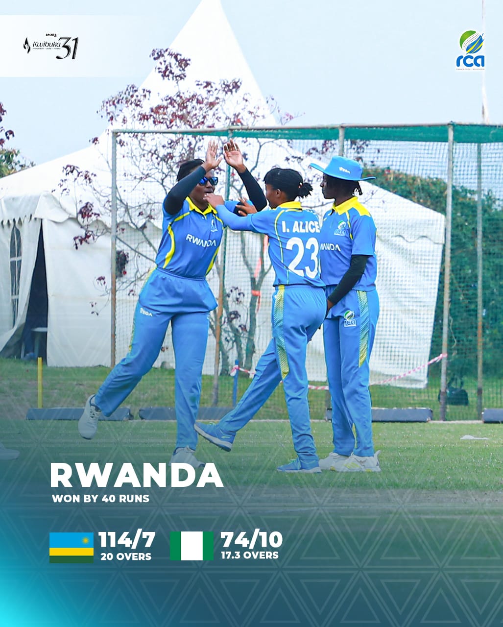 Ku ruhande rwa Nigeria ntabwo yashoboye gukuramo ikinyuranyo cyashyizweho n’u Rwanda kuko muri overs 17 n’udupira 3 dutatu, rwari rumaze gusohora abakinnyi bose ba Nigeria (All out) yo yari imaze gushyiraho amanota 74, byatumye u Rwanda rutsinda uyu mukino ku cyinyuranyo cy’amanota 40, Alice Ikuzwe ariwe wabaye umukinnyi mwiza w’umukino.