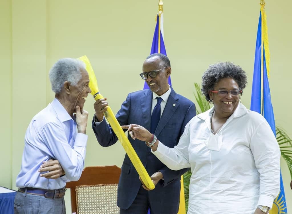 Aba banyabigwi, Sir Gary Sobers na Sir Wesley Winfield Hall bashyikirije Perezida Kagame impano.