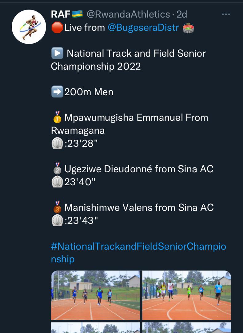Ku Cyumweru mu Karere ka Bugesera kuri stade y’imikino y’aka karere (Bugesera Stadium), hongeye kubera shampiyona y’imikino ngororamubiri izwi nka National Track and Field Senior Championship 2022, mu bahungu n’abakobwa, aho ikipe ya Nyamasheke yihariye imyanya y’imbere.