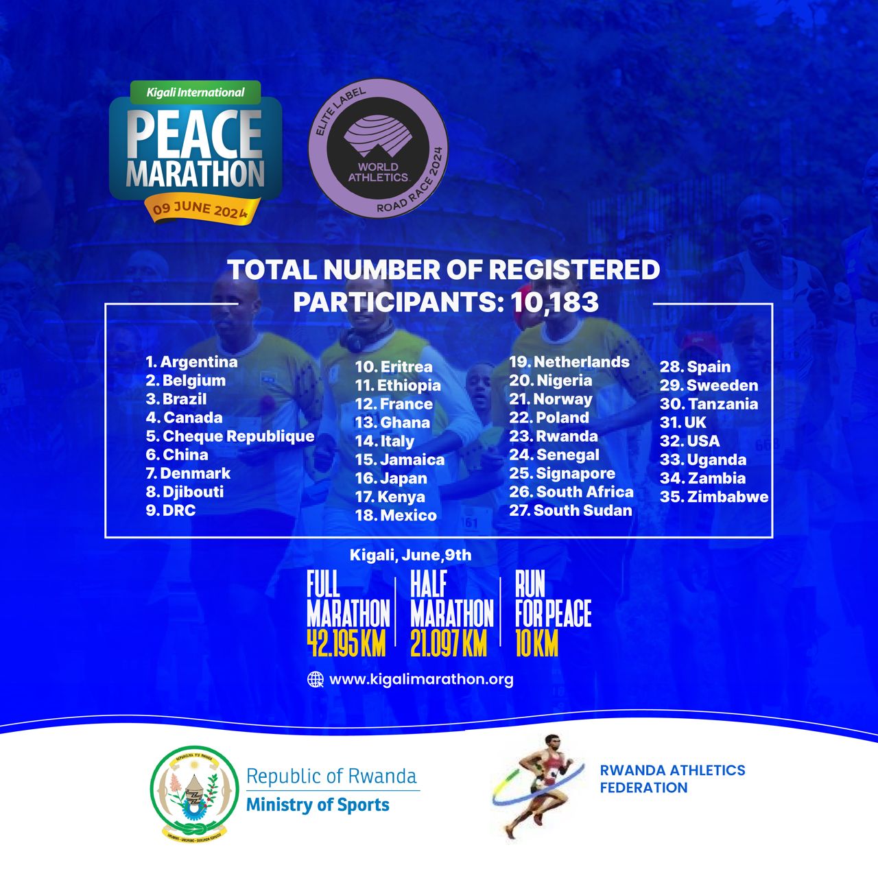 Muri rusange abitabiriye Kigali International Peace Marathon ku nshuro ya 19 baturutse mu bihugu 35 birimo Canada, Denmark, Pologne, u Butaliyani, Brazil, Jamaica, Singapore, Nigeria, Ghana n’ibindi. Imibare igaragaza ko abiyandikishije kwitabira ari 10,183 barimo abanyamahanga 4,001 mu gihe abandi 6,182 basigaye ari Abanyarwanda ndetse n’abanyamahanga batuye mu Rwanda.