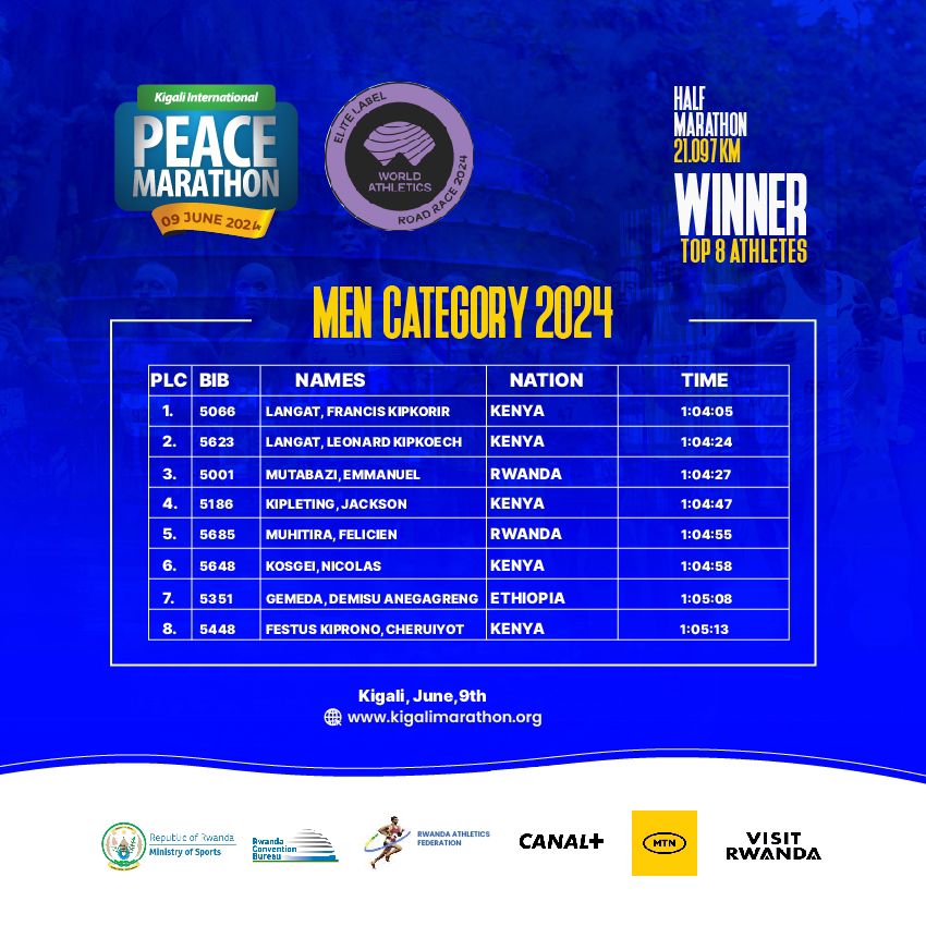 Muri iki cyiciro cya Half Marathon, umunya-Kenya Francis Kipkorir yegukanye umwanya wa mbere akurikirwa na mwenewabo Leonard Kipkoech Langat wamurushije amasegonda atatu, naho ku mwanya wa gatatu haza Umunyarwanda Mutabazi Emmanuel wegukanye Umudali wa Bronze nyuma yo kurushwa amasegonda 22.