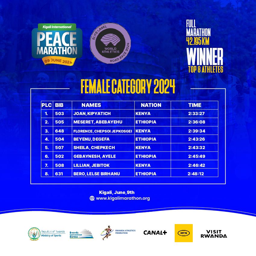 Naho mu bagore uwa mbere, umunya-Kenya Joan Kipyatich yakoresheje amasaha abiri, iminota 33 n’amasegonda 27, akurikirwa n’Umunya-Ethiopia, Meseret Abebavehu warushijwe iminota itatu, ku mwanya wa gatatu hagarukaho umunya-Kenya witwa Florence Chepsoi Jepkosgei warushijwe iminota itandatu.