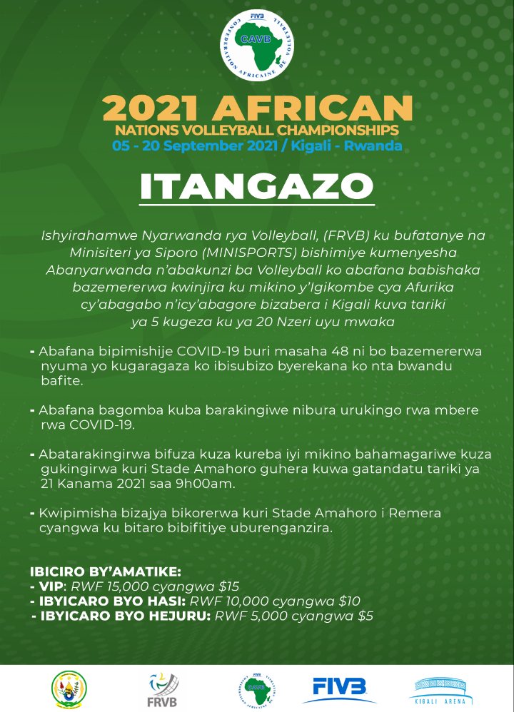 Ishyirahamwe ry’umukino wa Volleyball mu Rwanda “FRVB” ryamenyesheje abakunzi b’umukino wa Volleyball ko bemerewe kureba imikino y’igikombe cya Afurika mu bagabo n’abagore kizabera mu Rwanda mu byumweru bibiri biri imbere.