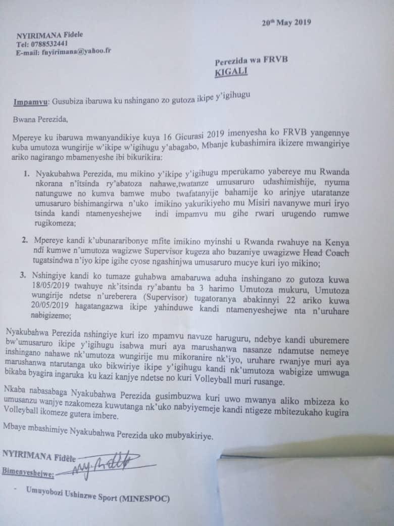 Kuri uyu wa Kabiri ni bwo ibaruwa yandikiye Federasiyo ya Volleball mu Rwanda (FRVB) yagiye ahagaragara, aho yatangaje zimwe mu mpamvu zatumye yanga kwitabira ubutumire mu ikipe y’igihugu nk’umutoza wungirije.