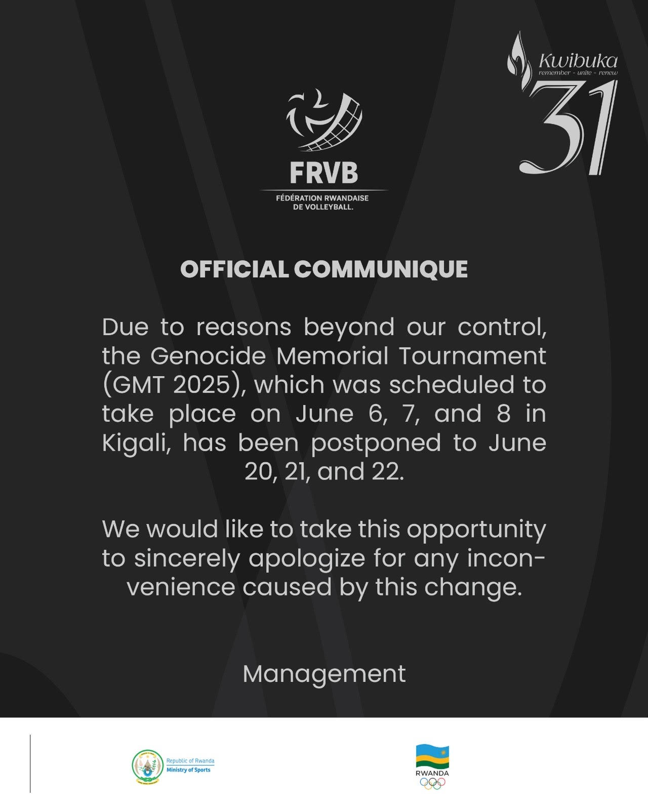 Rigira riti “Kubera impavu zitaduturutseho, irushanwa ryo kwibuka rya Volleyball Genocide Memorial Tournament 2025, ryari riteganyijwe kuba ku matariki ya 6, 7 na 8 Kamena 2025, ntirikibaye kuri ayo matariki, ahubwo ryimuriwe ku matariki ya 20, 21 na 22 Kamena 2025”. Bakomeje bisegura ku ngaruka izi mpinduka zateza.