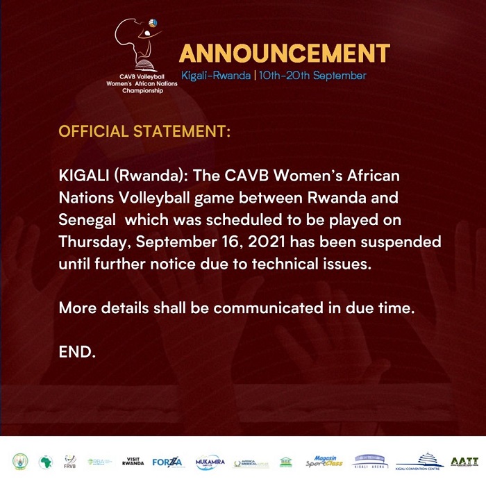 Visi Perezida w’impuzamashyiramwe y’umukino wa Volleyball muri Afurika (CAVB), yatangaje ko umukino w’u Rwanda na Senegal usubitswe kubera impamvu ziswe iza tekinike.