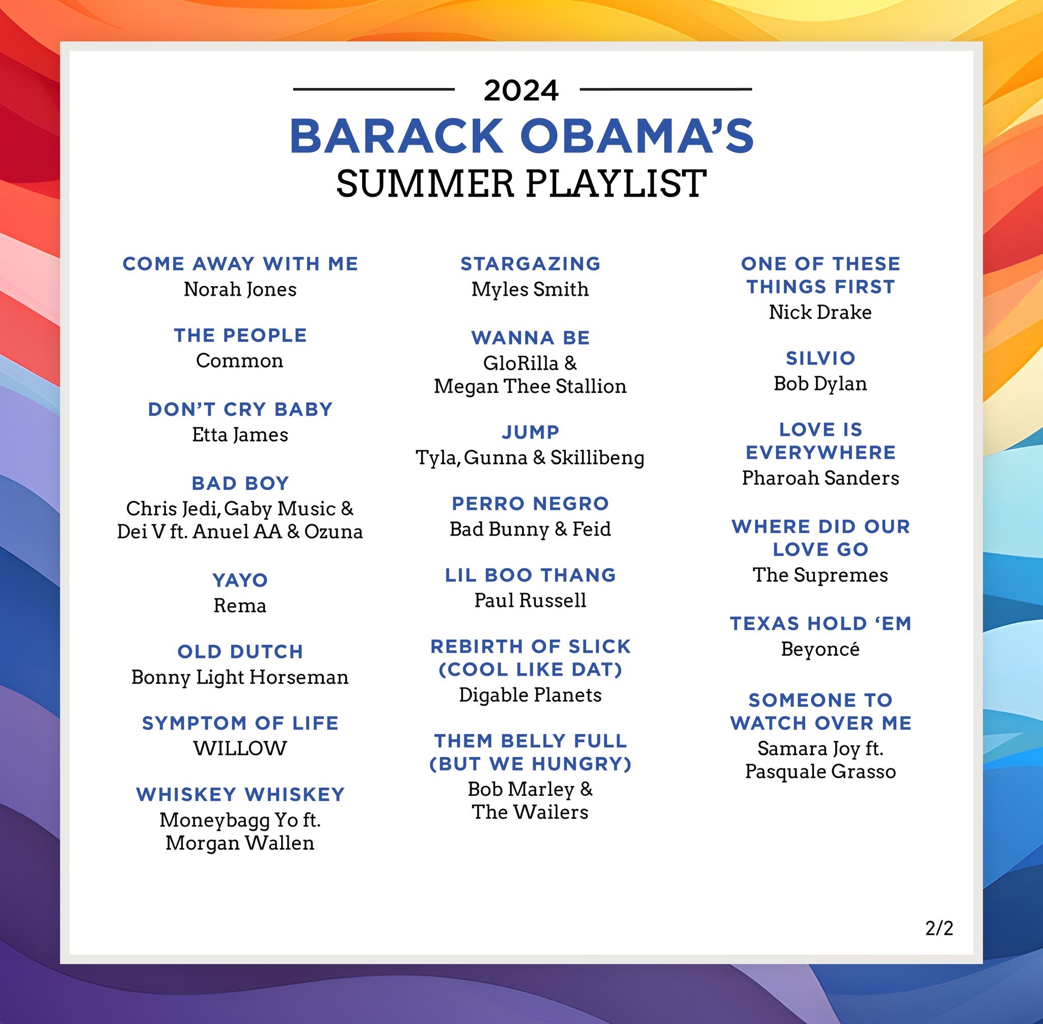 Obama yatangaje urutonde rw’izi ndirimbo zamunyuze muri iyi mpeshyi abinyujije ku mbuga nkoranyambaga ze, agira ati: "Ubwo impeshyi irangiye, nashakaga kubasangiza indirimbo zimwe na zimwe numvise vuba aha. Ntabwo rwaba ari urutonde rwange ruramutse rutagizwe n’uruvange rw’injyana zo mu bwoko butandukanye. Ndizera ko musangaho ikintu gishya cyo kumva!”.