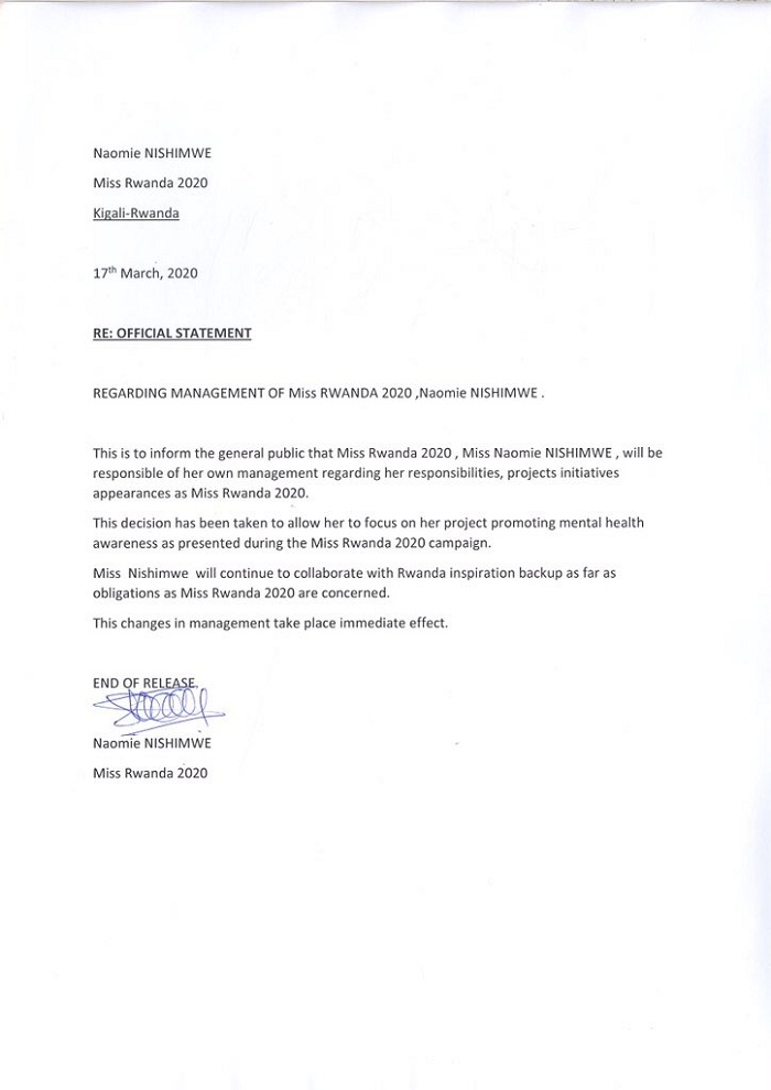 Iyi ni yo baruwa Miss Rwanda Nishimwe Naomie yanditse amenyesha abantu izo mpinduka
