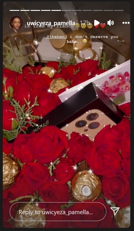 Mu magambo yanditse ku rukuta rwe rwa Instagram, Miss Uwicyeza Pamella yashimiye umukunzi we ku bw’impano idasanzwe, agira ati “Iyi mpano yaturutse ku nshuti yanjye (Fiancé), birandenga nkumva ntagukwiriye mukundwa”.