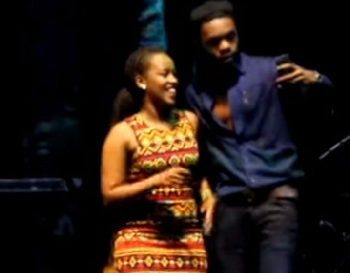 Hashize umwanya munini Patoranking ari kumwe n’uwo mukobwa ku rubyiniro bigera aho uwo muririmbyi akuramo ingofero n’ishati abiha uwo mukobwa anamuha amadarubindi.