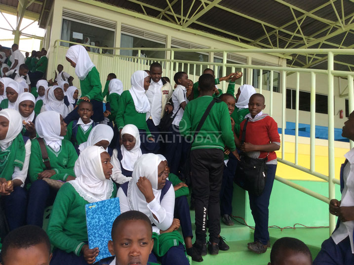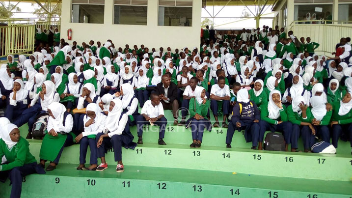 Senderi yari ari muri Stade i Nyamirambo ari gushyushya abahateraniye barimo abanyeshuri, bategereje abashyitsi bakuru ngo icyo gikorwa nyirizina gitangire.