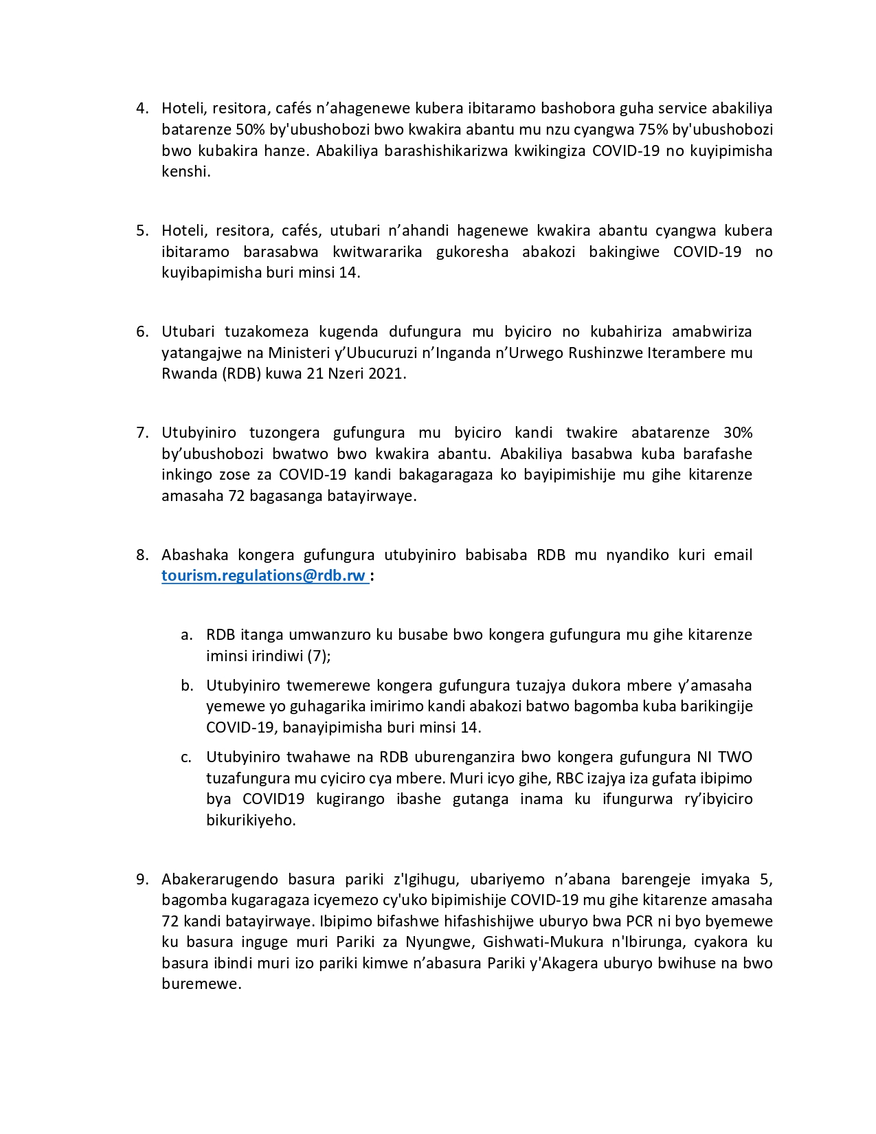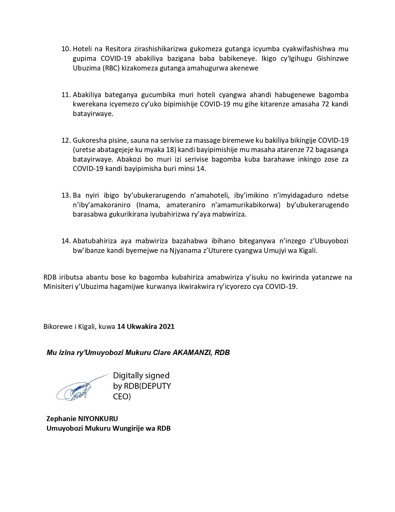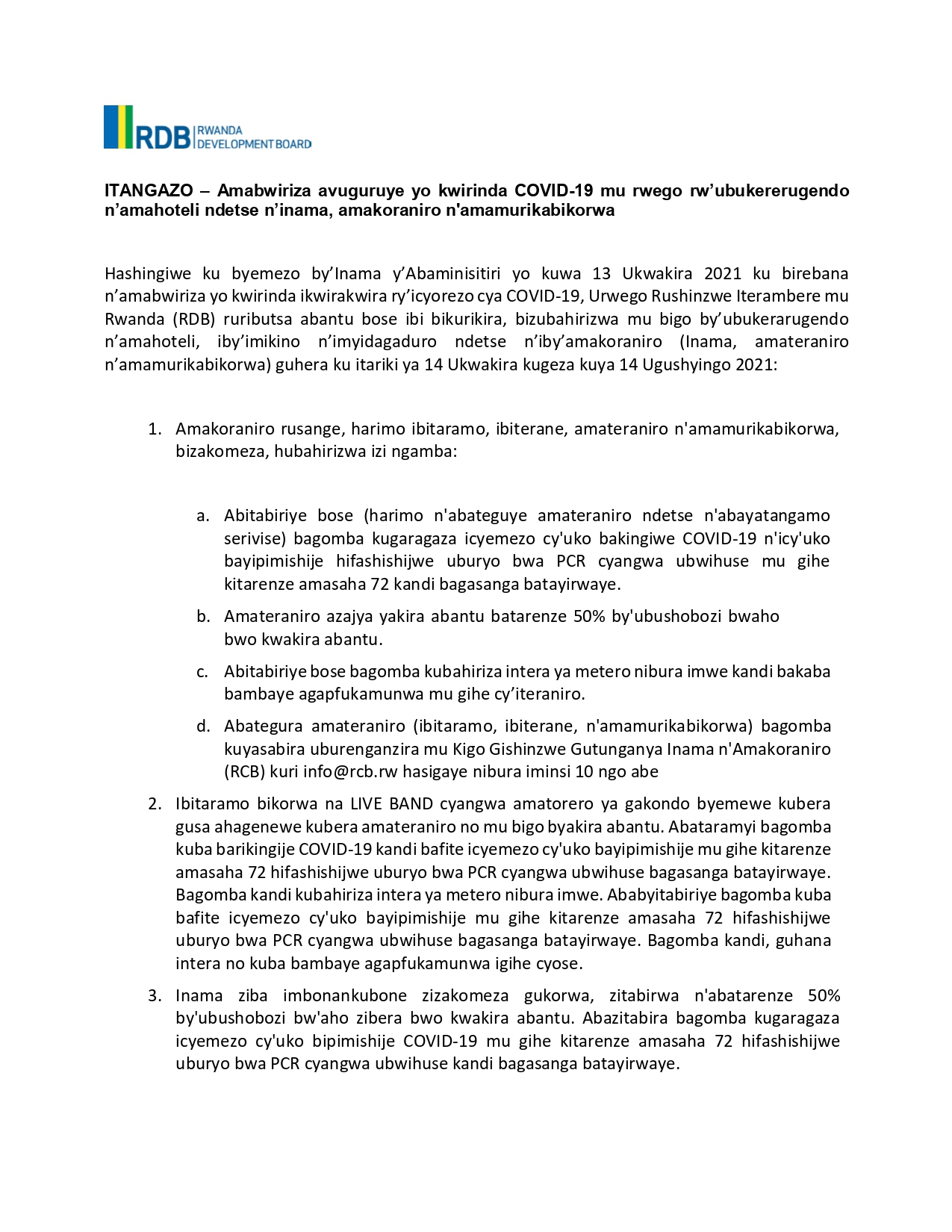 Itangazo ryasohowe na RDB kuri uyu wa Kane tariki 14 Ukwakira 2021, rigira riti “Hashingiwe ku byemezo by’inama y’Abaminisitiri yo ku wa 13 Ukwakira 2021 ku birebana n’amabwiriza yo kwirinda Covid-19, Urwego rushinzwe iterambere mu gihugu (RDB), ruributsa abantu bose ibi bikurikira, bizubahirizwa mu bigo by’ubukerarugendo n’amahoteli, iby’imikino n’imyidagaduro ndetse n’iby’amakoraniro (Inama, amakoraniro n’amamurikabikorwa) guhera tariki ya 14 Ukwakira kugera kuya 14 Ugushyingo 2021”.