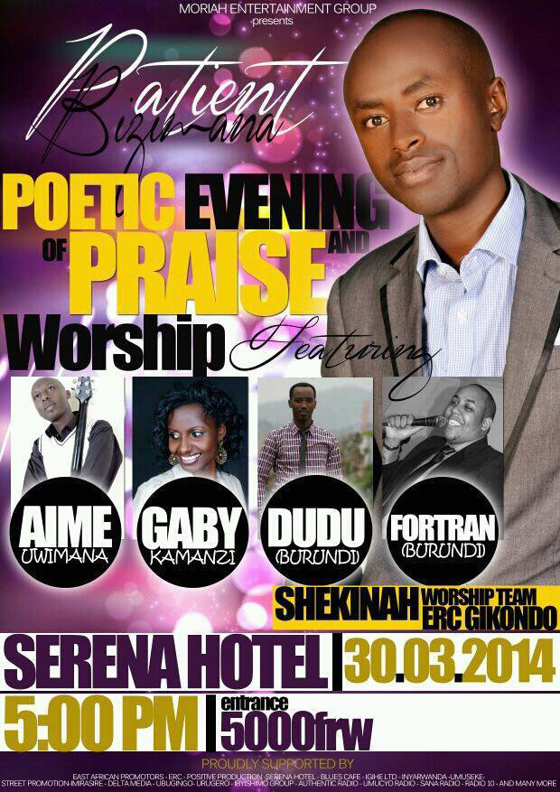 Umuhanzi mu ndirimbo zihimbaza Imana Patient Bizimana, yateguye igitaramo cyo kuramya no guhimbaza Imana yise “Poetic Evening of praise and worship”, iki gitaramo kikaba kizaba ku itariki ya 30.3.2014 muri Kigali Serena Hotel.
