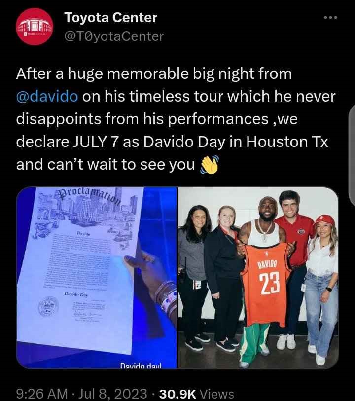 Umuhanzi David Adeleke wamamaye nka Davido, ubuyobozi bw’umujyi Huston muri Leta Zunze Ubumwe za Amerika bwategetse ko tariki 07 Nyakanga buri mwaka ari umunsi wahariwe uyu muhanzi ‘Davido Day’.