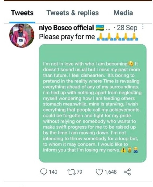 Mu ibaruwa yagize ati “Ntabwo ndi gukunda uwo ndi kuba we, ntabwo byumvikana nk’ibisanzwe ariko nkumbuye ahahise hanjye kuruta ejo hazaza. Ndumva nacitse intege cyane”.