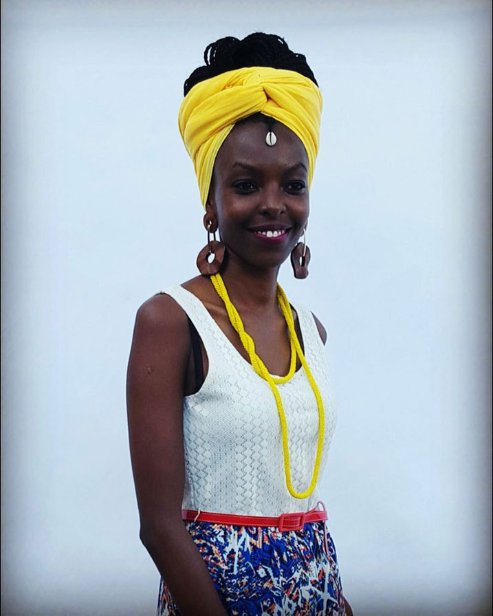 Ayo mafoto amugaragaza akenyeye bya Kinyarwanda, imyambaro yiganjemo ibara ry’umweru n’umuhondo, amaherena ku matwi, urunigi, ibikomo ku kuboko kw’iburyo n’imisatsi miremire irimo ibara ry’umweru yafungiye inyuma.