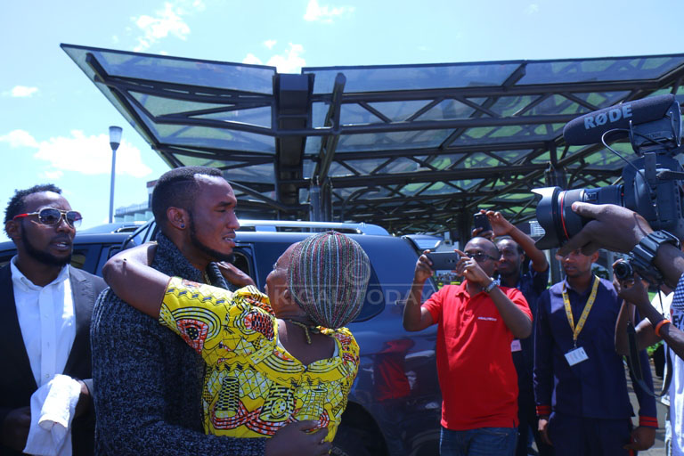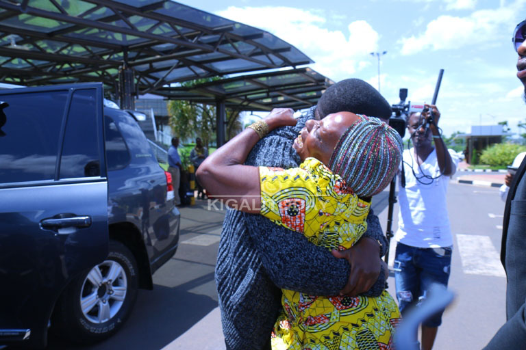 Ubwo yari akigera ku kibuga cy’indege cya Kanombe yakiriwe n’abantu batandukanye barimo nyirakuru wamwakiranye urugwiro amuhobera, ibyishimo birabataha bombi bararira.