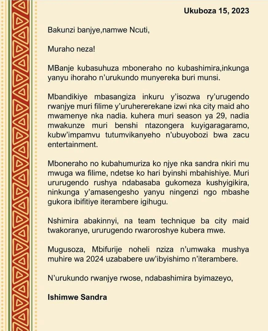Mu itangazo yashyize hanze, tariki 15 Ukuboza 2023, Sandra yahamije ko yasezeye gukina muri iyi filime kubera ibyo atumvikanyeho n’ubuyobozi bwa Zacu Entertainment.