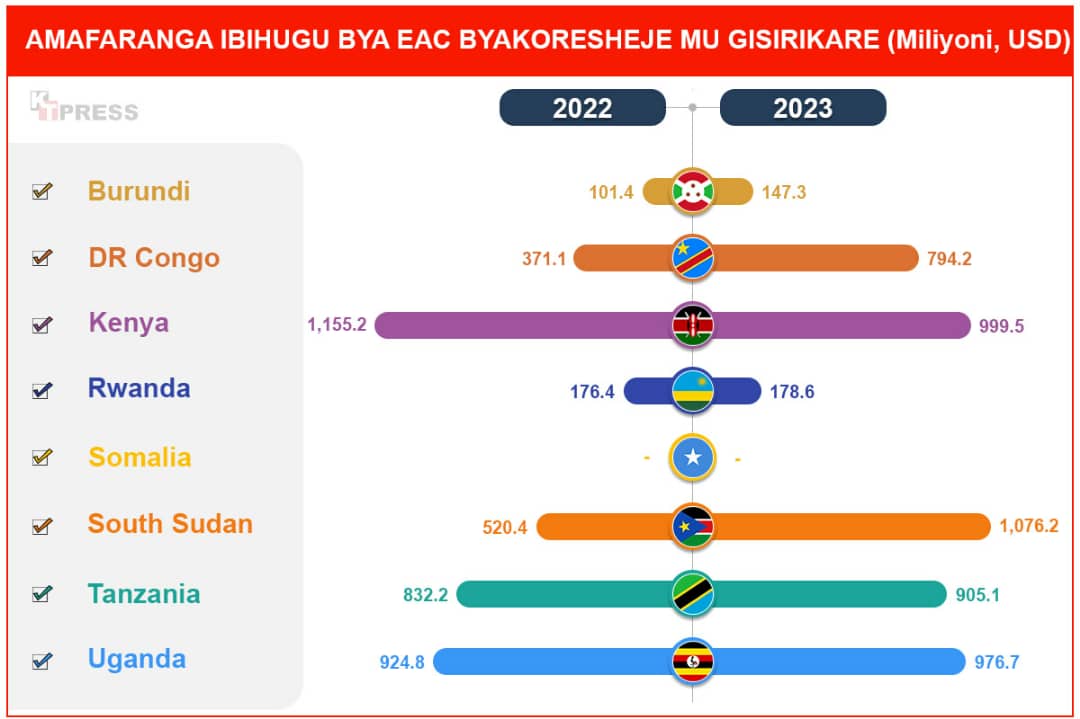 Ibihugu by’u Rwanda, Uganda, Kenya, Burundi, Tanzania, DRC, Somalia na Sudani y’Epfo bigize Umuryango w’Afurika y’Iburasirazuba (EAC) bikomeje kongera Ingengo y’Imari ikoreshwa mu gisirikare by’umwihariko mu gutumiza intwaro mu mahanga, bifatwa nk’ibiteje impungenge ku mutekano mu Karere.