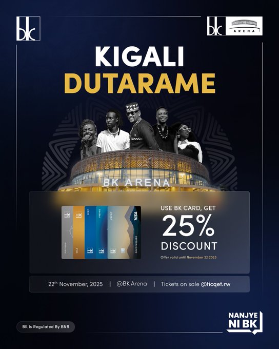 Gura itike yo kwitabira igitaramo Kigali dutarame, wishyure ukoresheje ikarita iyo ari yo yose ya @BankofKigali maze uhabwe igabanyirizwa rya 25%🔥.