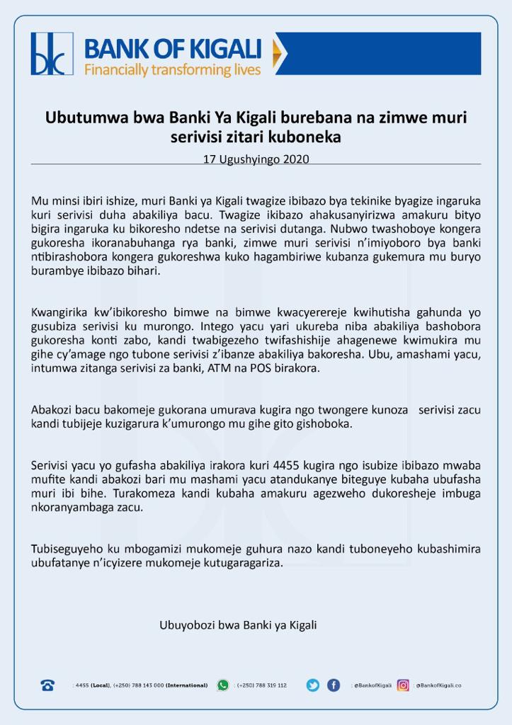 Itangazo BK yashyize ahagaragara rigira riti “Twagize ikibazo ahakusanyirizwa amakuru bityo bigira ingaruka ku bikoresho ndetse na serivisi dutanga. Nubwo twashoboye kongera gukoresha ikoranabuhanga rya banki, zimwe muri servisi n’imiyoboro bya banki ntibirashobora kongera gukoreshwa kuko hagambiriwe kubanza gukemura mu buryo burambye ibibazo bihari.”