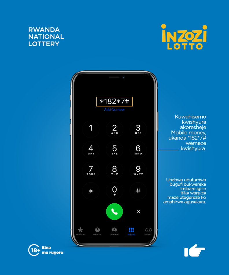 9. Ku wahisemo kwishyura akoresheje Mobile Money, ukanda *182*7# wemeze kwishyura. Uhabwa ubutumwa bugufi bukwereka imibare igize itike waguze maze utegereze ko amahirwe agusekera.