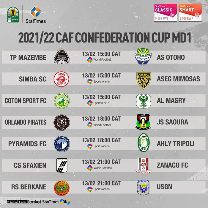 Iki cyumweru kandi kizarangwa n’imikino ya CAF Confederations Cup muri ruhago. Iri rushanwa ni ryo ririmo amakipe yo mu Karere nka SIMBA SC ya Tanzaniya ikinwamo n’umunyarwanda KAGERE Meddy na TP Mazembe yo muri RD Congo, na yo yigeze gutwara iri rushanwa.
