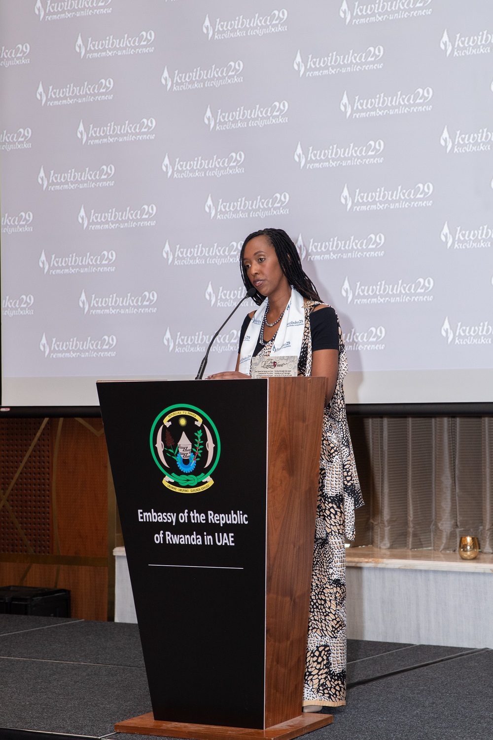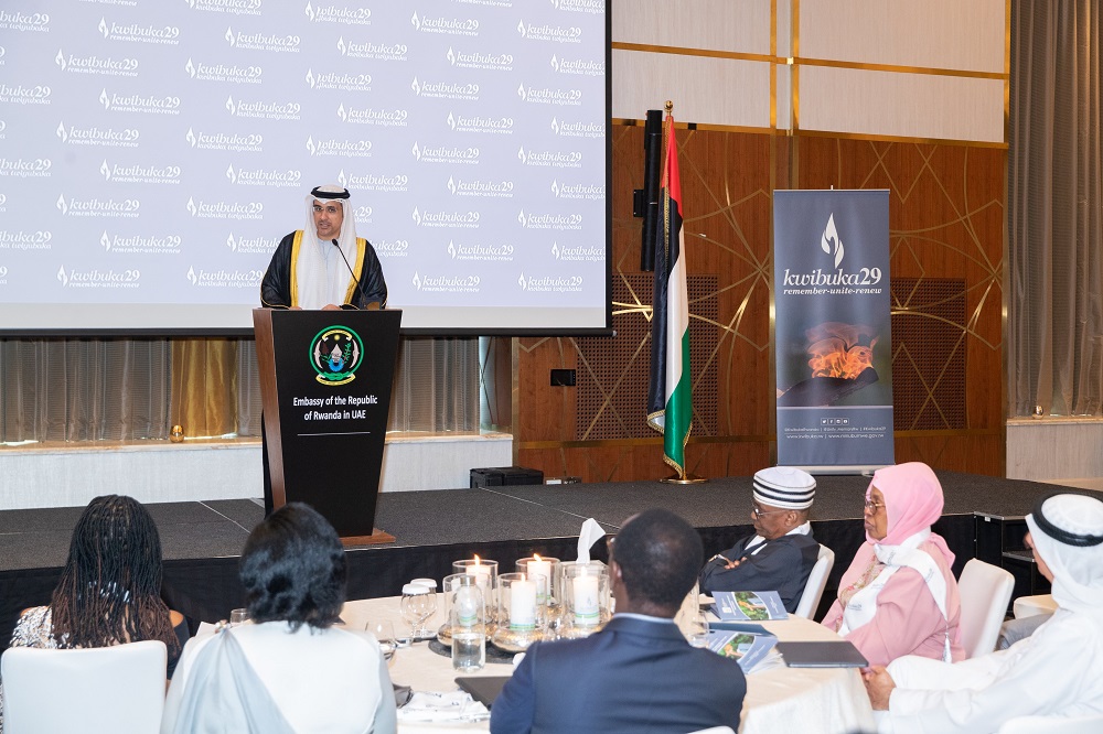 Ambasaderi w’u Rwanda muri UAE, Emmanuel Hategeka, yasabye abari aho gufata umwanya wo kubanza kunamira no guha icyubahiro abazize Jenoside, ndetse no kuzirikana abayirokotse, ahamagarira amahanga kongera imbaraga mu kwamagana abagikomeje guhakana Jenoside yakorewe Abatutsi mu 1994.