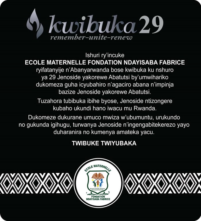 Mu butumwa ryatanze, iryo shuri rigira riti “Ecole Maternelle Fondation Ndayisaba Fabrice, ryifatanyije n’Abanyarwanda bose kwibuka ku nshuro ya 29 Jenoside yakorewe Abatutsi, by’umwihariko dukomeza guha icyubahiro n’agaciro abana n’impinja bazize Jenoside yakorewe Abatutsi”.