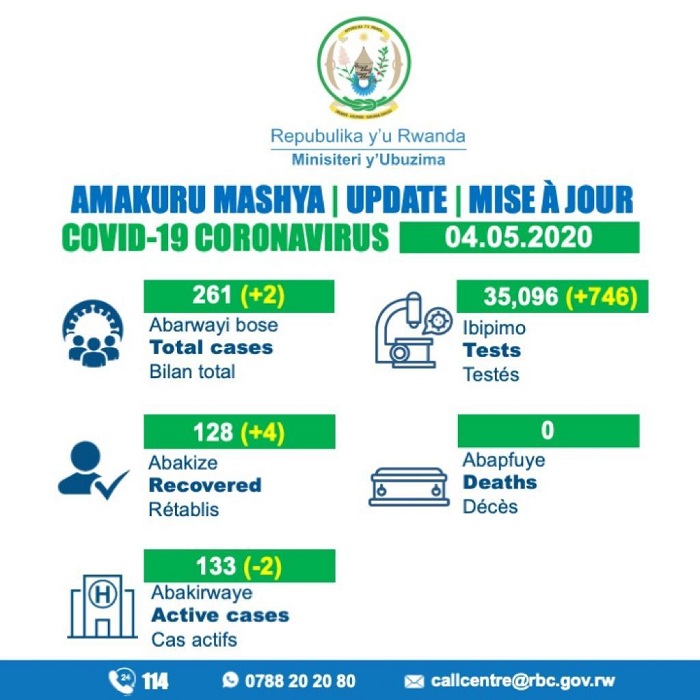 Minisiteri y’Ubuzima (MINISANTE) iratangaza ko kuri iki Cyumweru tariki ya 03 Gicurasi 2020, mu Rwanda habonetse abandi barwayi bane bashya banduye COVID-19. Abo bagaragaye mu bipimo 1,047 byafashwe uyu munsi, mu gihe ibipimo byose hamwe bimaze gufatwa mu Rwanda ari 34,350.
