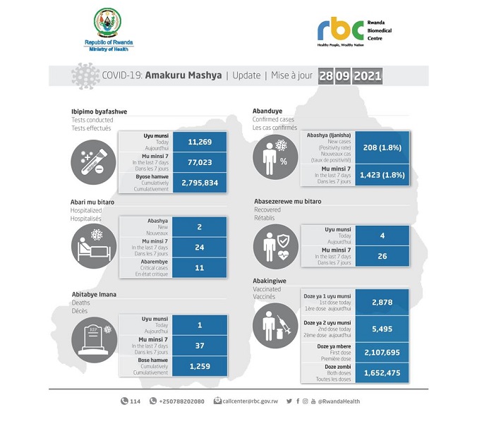 Minisiteri y’Ubuzima (MINISANTE) yatangaje ko ku wa Kabiri tariki 28 Nzeri 2021 mu Rwanda habonetse abanduye Covid-19 bashya 208, bakaba babonetse mu bipimo 11,269.