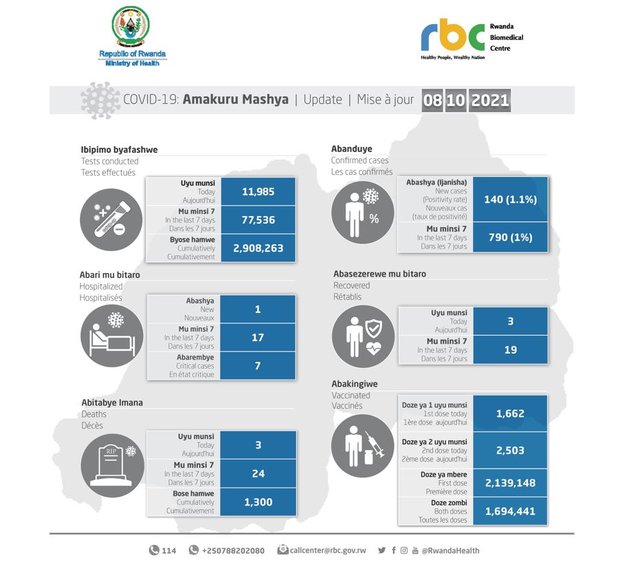 Minisiteri y’Ubuzima (MINISANTE) yatangaje ko ku wa Gatanu tariki 08 Ukwakira 2021 mu Rwanda habonetse abanduye Covid-19 bashya 140, bakaba babonetse mu bipimo 11,985. Abantu batatu bitabye Imana, bakaba ari abagore 2 n’umugabo 1.