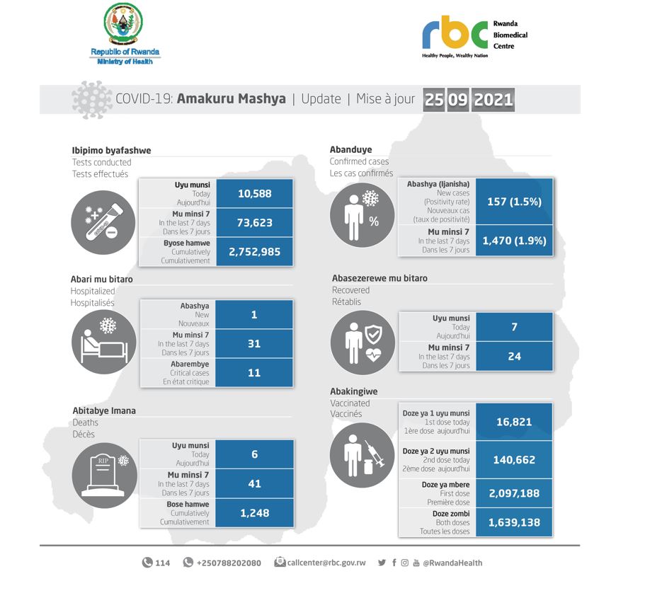 Minisiteri y’Ubuzima (MINISANTE) yatangaje ko ku wa Gatandatu tariki 25 Nzeri 2021 mu Rwanda habonetse abanduye Covid-19 bashya 157, bakaba babonetse mu bipimo 10,588. Abitabye Imana ni batandatu, bakaba ari abagore batatu n’abagabo batatu.