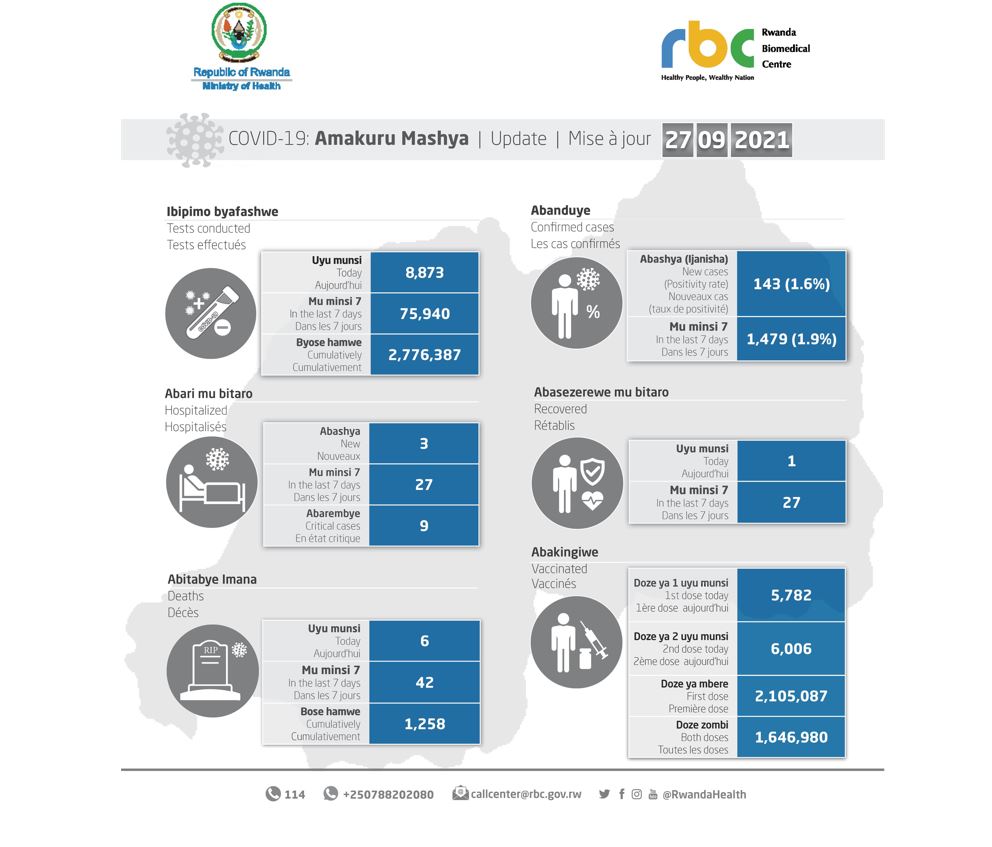 Minisiteri y’Ubuzima (MINISANTE) yatangaje ko ku wa Mbere tariki 27 Nzeri 2021 mu Rwanda habonetse abanduye Covid-19 bashya 143, bakaba babonetse mu bipimo 8,873.