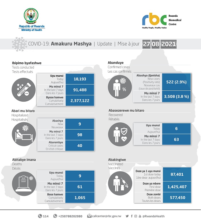 Minisiteri y’Ubuzima yatangaje ko ku wa Gatanu tariki 26 Kanama 2021 mu Rwanda habonetse abanduye Covid-19 bashya 522 bakaba babonetse mu bipimo 18,193. Iyo Minisiteri itangaza kandi ko abantu 9 bitabye Imana kubera icyo cyorezo, bituma umubare w’abamaze gupfa bose uba 1065. Abitabye Imana ni abagore 4 n’abagabo 5. (…)