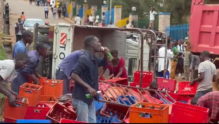Ku mugoroba tariki ya 13 Werurwe 2023, mu Murenge wa Kimisagara mu Karere ka Nyarugenge, imodoka ifite purake RAE 913 A yari ipakiye inzoga izivanye mu Karere ka Kicukiro, yageze hafi ya Maison de Jeunes irabirinduka inzoga yari ipakiye zirameneka, abaturage bihutira kureba izarokotse bimara inyota.