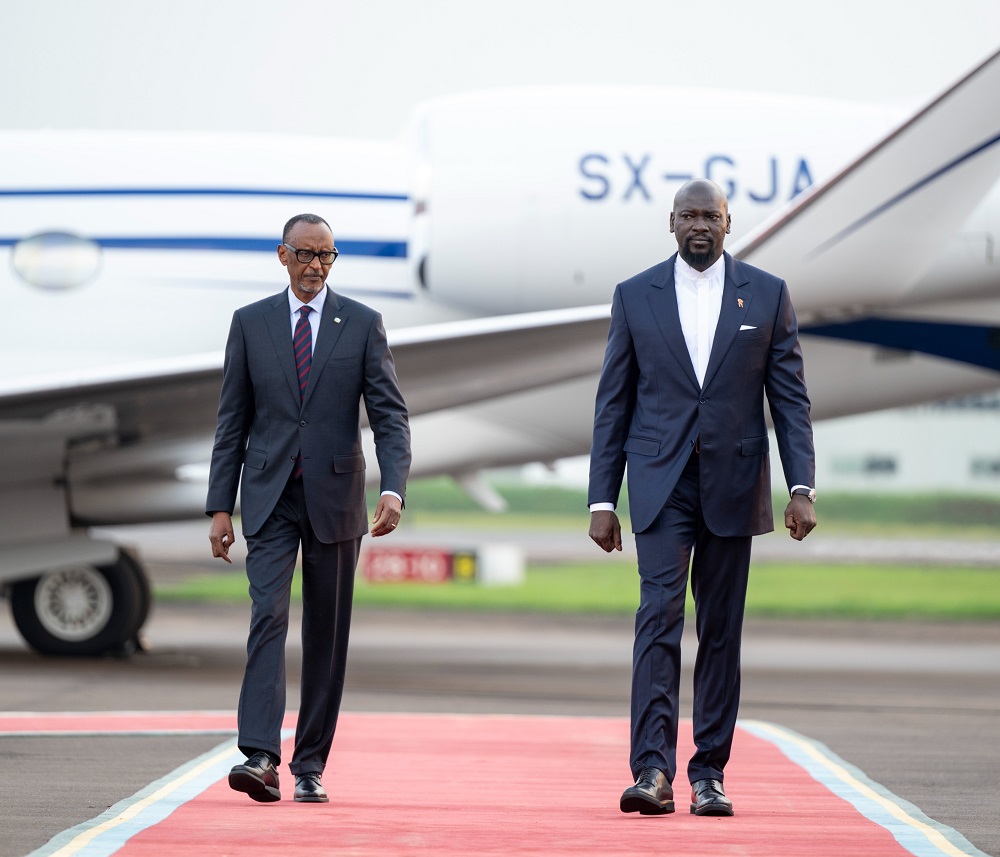 Perezida wa Guinée Conakry, Lt Gen Mamadi Doumbouya na Madamu we Lauriane Darboux Doumbouya, basoje urugendo rw’iminsi itatu bagiriraga mu Rwanda kuri uyu wa Gatandatu tariki 27 Mutarama 2024, baherekezwa na Perezida Paul Kagame na Madamu we ku kibuga cy’indege i Kanombe.